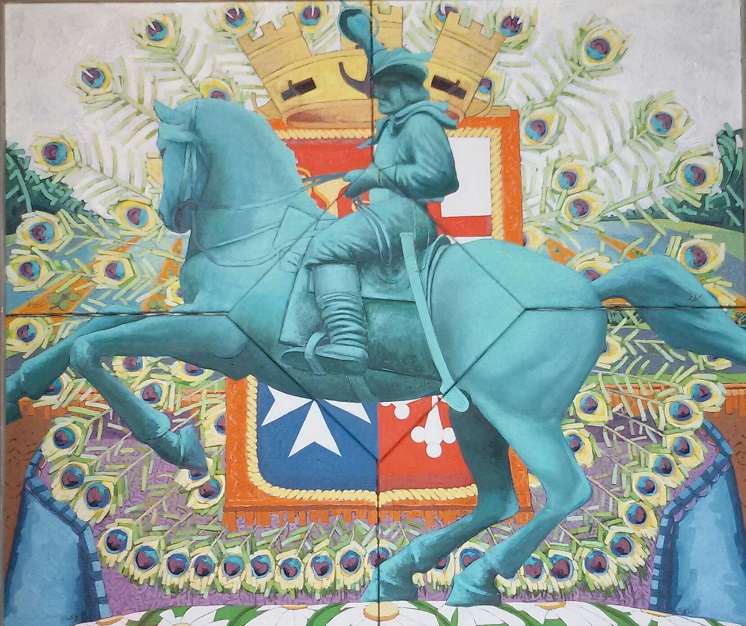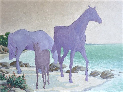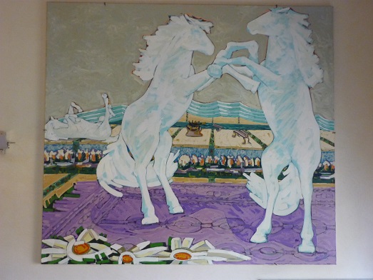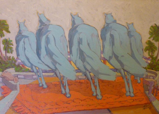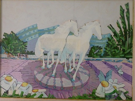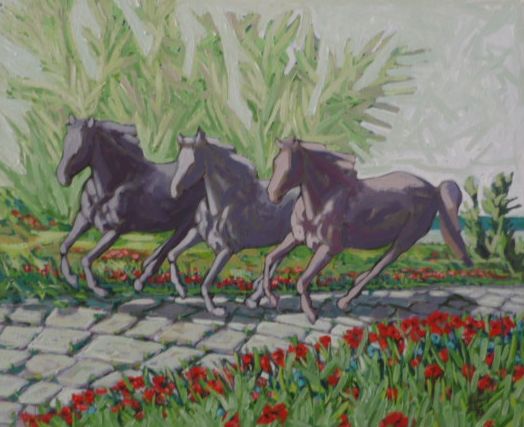 Giocolieri danzanti - olio su tela - 50 x 40 - 1999 Idee svizzere  Cavalli su centro - olio su tela - 70 x 50 -Collezione privata
