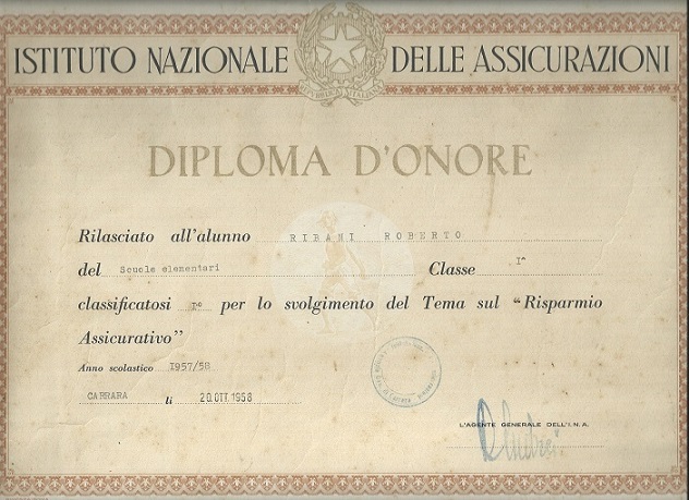 1958 | Carrara | Concorso bandito da Istituto Nazionale delle Assicurazioni Diploma d’Onore classificatosi 1° |